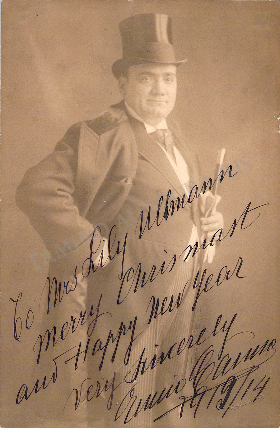 Gorgeous sepia photograph of the Italian tenor shown as himself, signed and inscribed by him with a short sentiment in English dated December 19, 1914; blind-stamped over the lower-right corner by the photographer.  Size is 5.75 x 8.75 inches, in excellent condition.