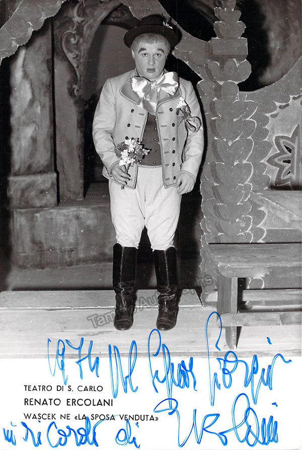 Italian baritone (1920-2002), signed photograph, shown in Smetena's Bartered Bride, inscribed. Stamped on verso by photographer Troncone, Naples. Size is 4.75 x 7 inches, in excellent condition.
