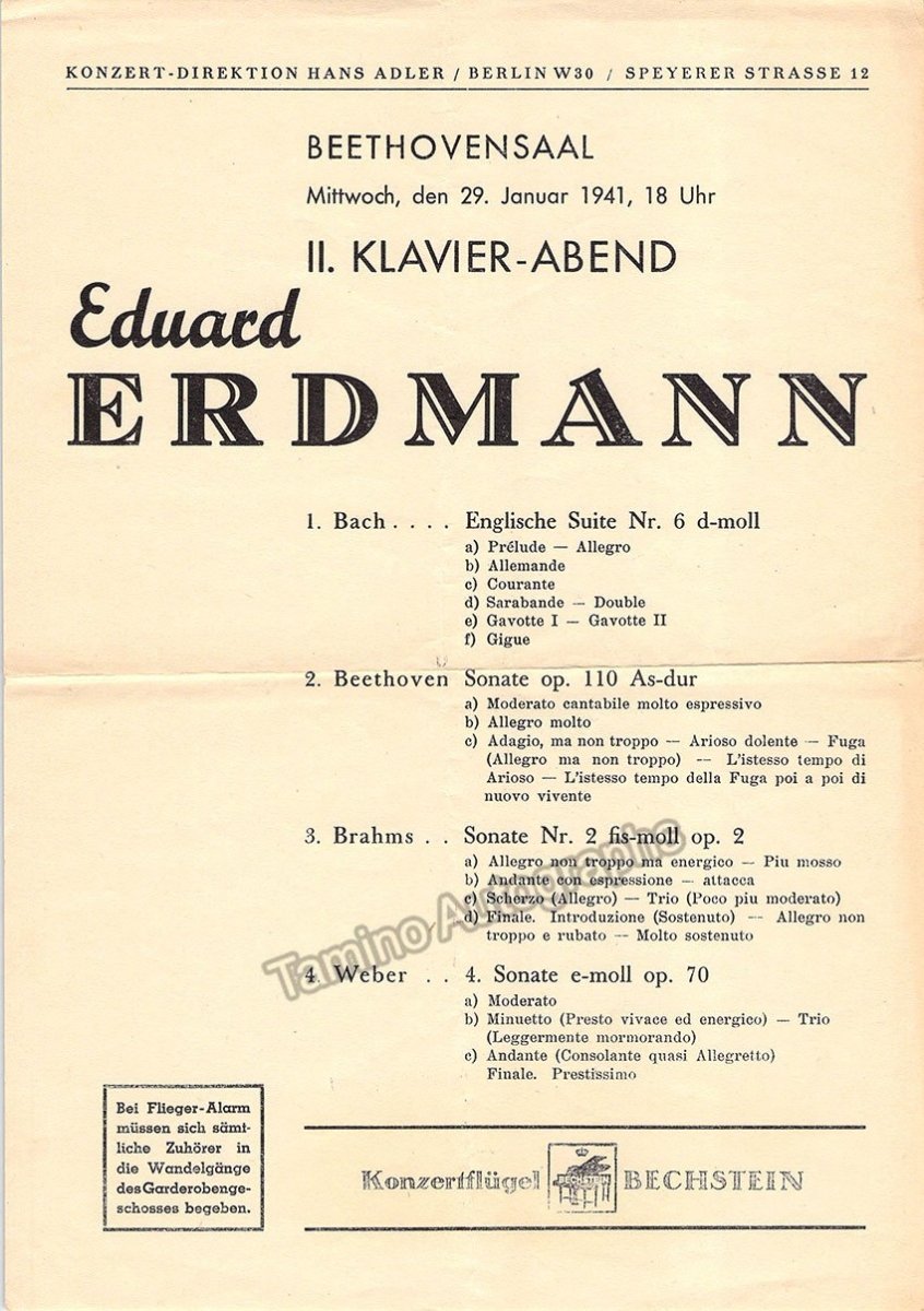 One page program for a concert at the Beethovensaal, Berlin, January 29th, 1941. Eduard Erdmann solo recital, size is 8.1 x 11.6 inches, has folds, otherwise in very good condition.