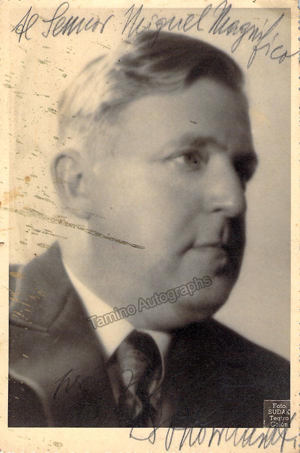 German-born opera stage director (1888-1971) who worked throughout Europe, the U.S and eventually served as the production director at the Teatro Colon, Buenos Aires. Signed photo, inscribed. Photo by Sudak, Teatro Colon. Size is 4.5 x 7 inches, some smudges on left side of photo, but in otherwise good condition.