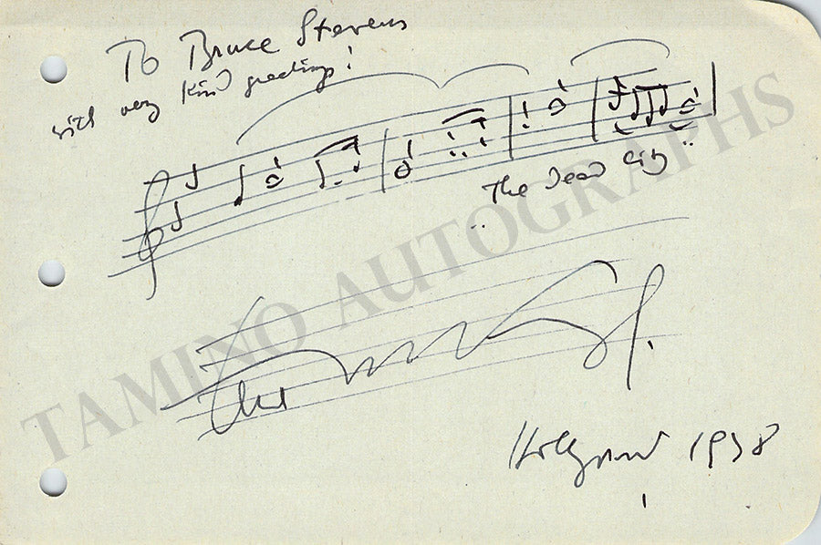 4-bar autograph music quote from his opera The Dead City signed and inscribed by him with a short sentiment dated 1938. Size is 5.75 x 3.8 inches, storage holes, in excellent condition.