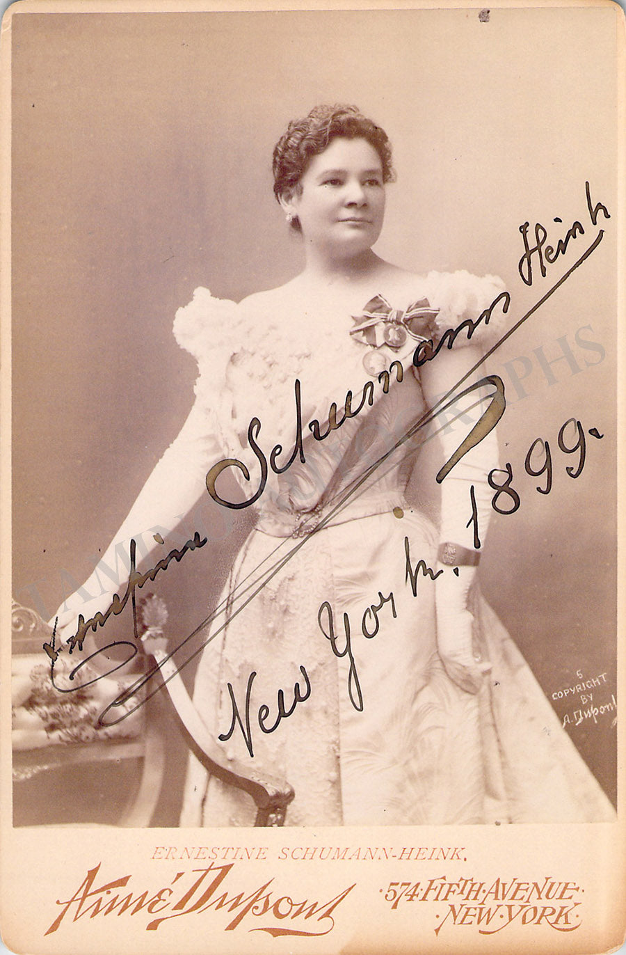 Original cabinet photograph of her in her younger days by photographer Aimé Dupont (New York) signed by Schumann-Heink. Size is 4.25 x 6.5 inches, in excellent condition.