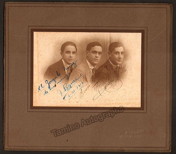 Beautiful sepia photograph signed by him and two of his friends J. Piguer and Raul Alghetti, mounted on a photographer mat, blind-stamped on the front by photographer Naranjo (Havana), dated 1919. Total size is 10 x 9 inches, spotted rust stains, in overall very good condition.