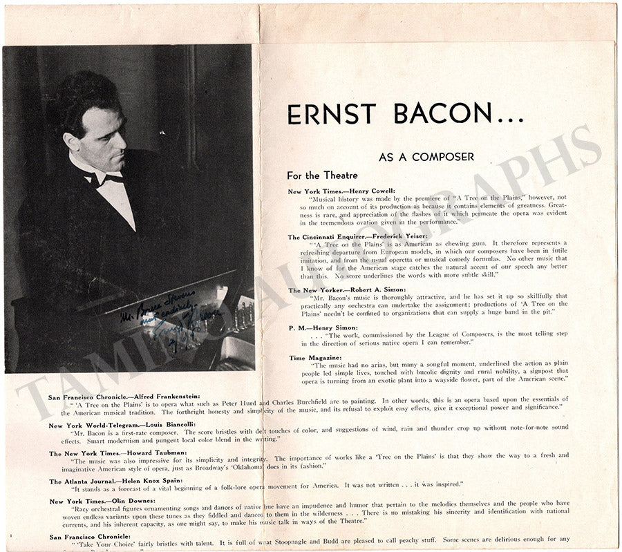 Beautiful tri-folded promotional brochure as playbill with his image at the piano signed and inscribed by him in 1950. Size is 10.8 x 9.75 inches, in very good condition.