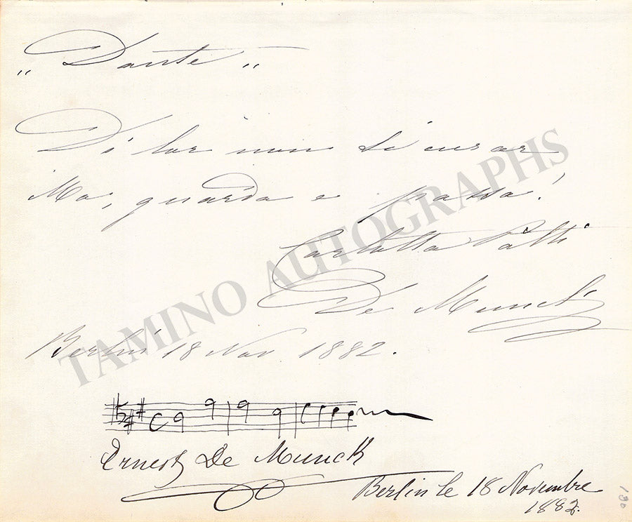 An album page signed by both artists on the same date November 18, 1882. Munch signed over the bottom with a 3-bar music quote, while Patti signed over the top.  Size is 8 x 6.75 inches, in excellent condition.