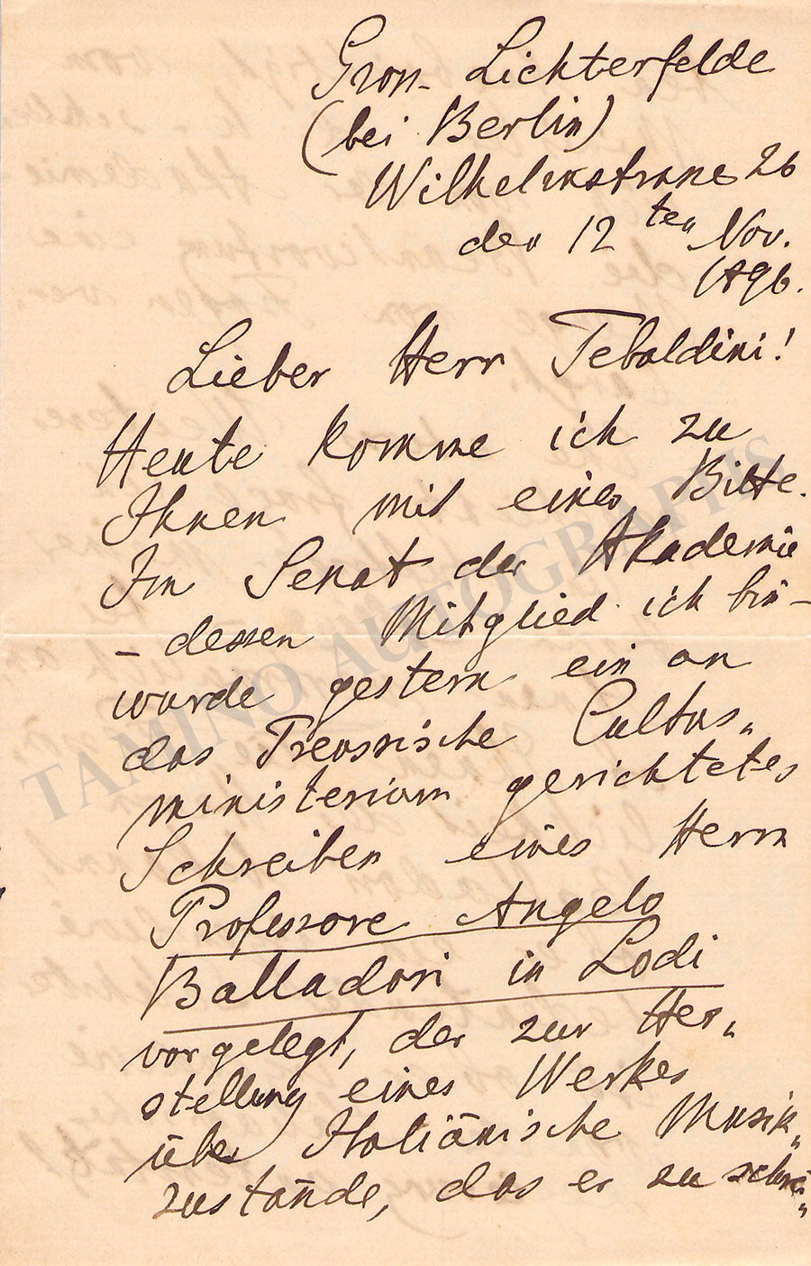Autograph letter in German signed by him, dated in Berlin, 1896, to the Italian composer Giovanni Tebaldini: