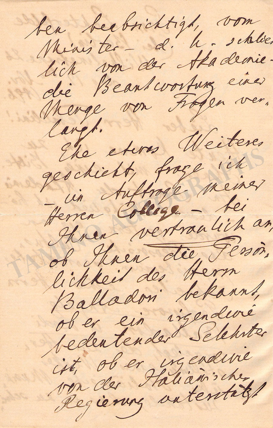 Partial translation: “…Today I come to you with a request. Yesterday, in the Senate of the Academy - of which I am a member - a letter addressed to the Prussian Ministry of Culture from Professor Angelo Balladoni in Lodi was presented, who is entitled to work on Italian music, which he intends to write, from the Minister - i.e. he is requesting the Academy to answer a number of questions. Before doing anything else, I would like to ask you, on behalf of my college, if you know the identity of Mr. Balladoni, if he is an important Scholar, if he is supported by the Italian Government, if he is personally reliable. Hopefully, you can give us some information! (…) Have you received the Gloria from Lotti? The Copist of the college has already copied it to you one summer, and to your credit, since you asked me to have it copied to you on account of the Church of San Antonio…”.