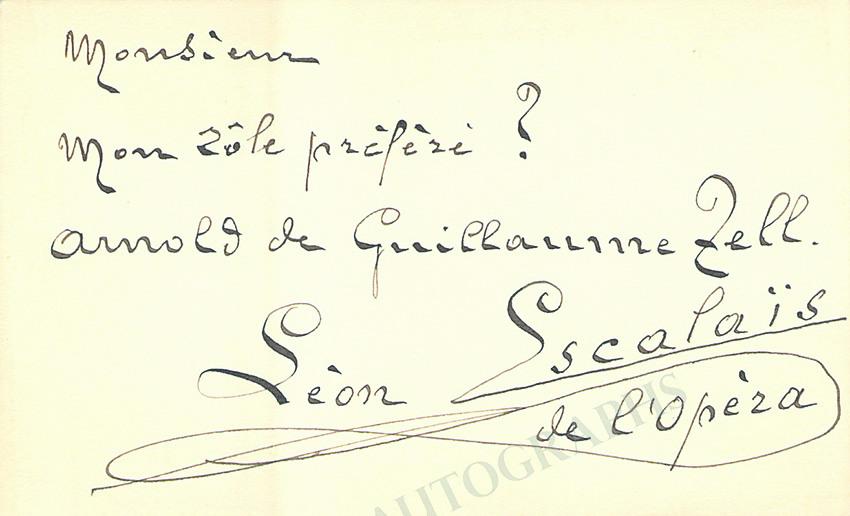 Signed card, where he wrote, in French, "Sir, my favorite role? Arnold in Guillaume Tell". Size is 4.1 x 2.5 inches, in excellent condition. Autographs of Escalais are very scarce!
