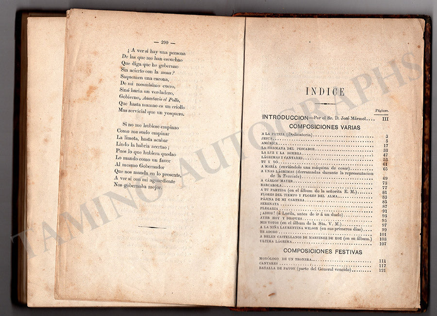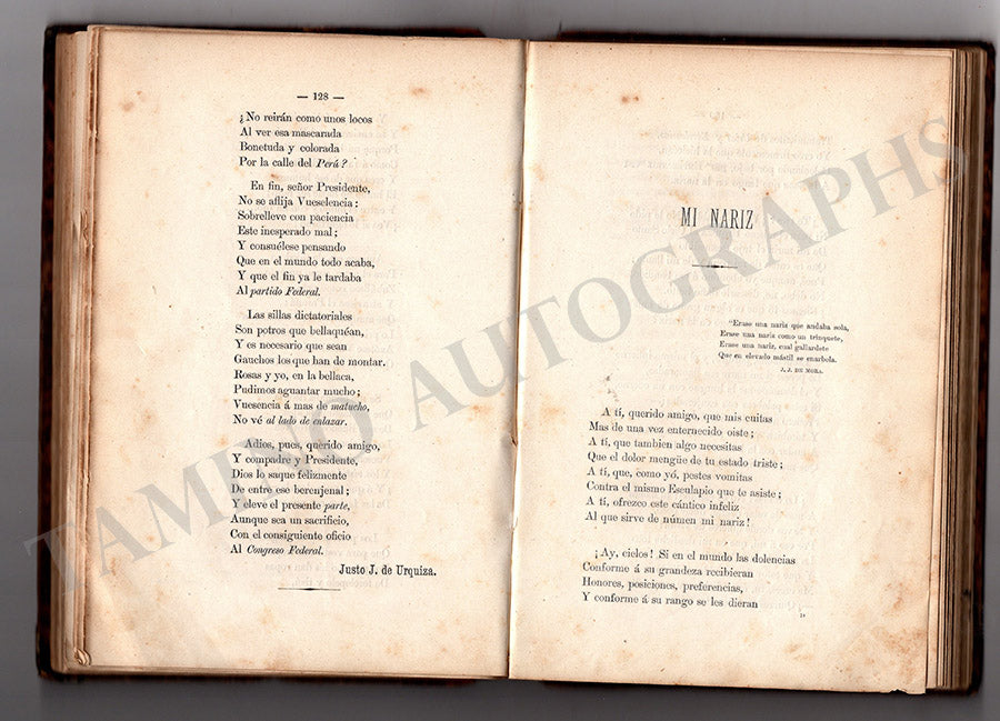 His book Poesias signed by him on the opposite of the title page alongside his image, published by Librerias de Mayo, 1875. Size is 6.5 x 9.2 inches, no original covers, 290 pages, in very good condition.