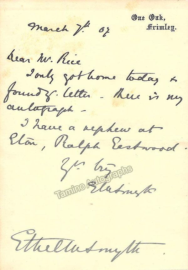 Short autograph note signed by her, dated 1907. Size is 3.9 x 5.6 inches, mounting traces on verso, in very good condition.
