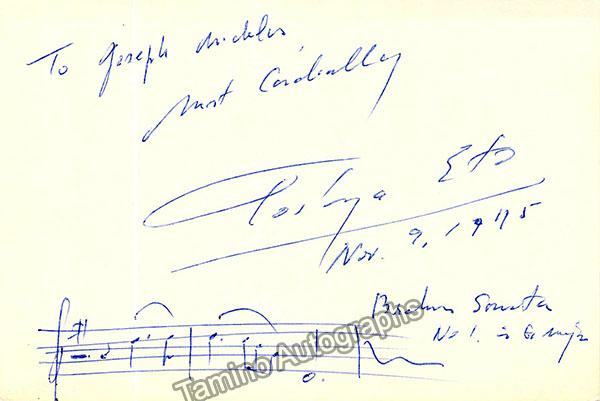 Japanese violinist (1927-2008), debuted at Carnegie Hall in 1951 and had a career as a soloist before focusing on education of young violinists in Japan. Signed autograph music quote on a card, with 2 bars of Brahms Sonata n°1, inscribed and dated in 1975. Size is 6 x 4 inches, in excellent condition. ALSO INCLUDED is and unsigned photo, of the violinist, shown in performance. Size is 7.75 x 5.1 inches, in excellent condition.