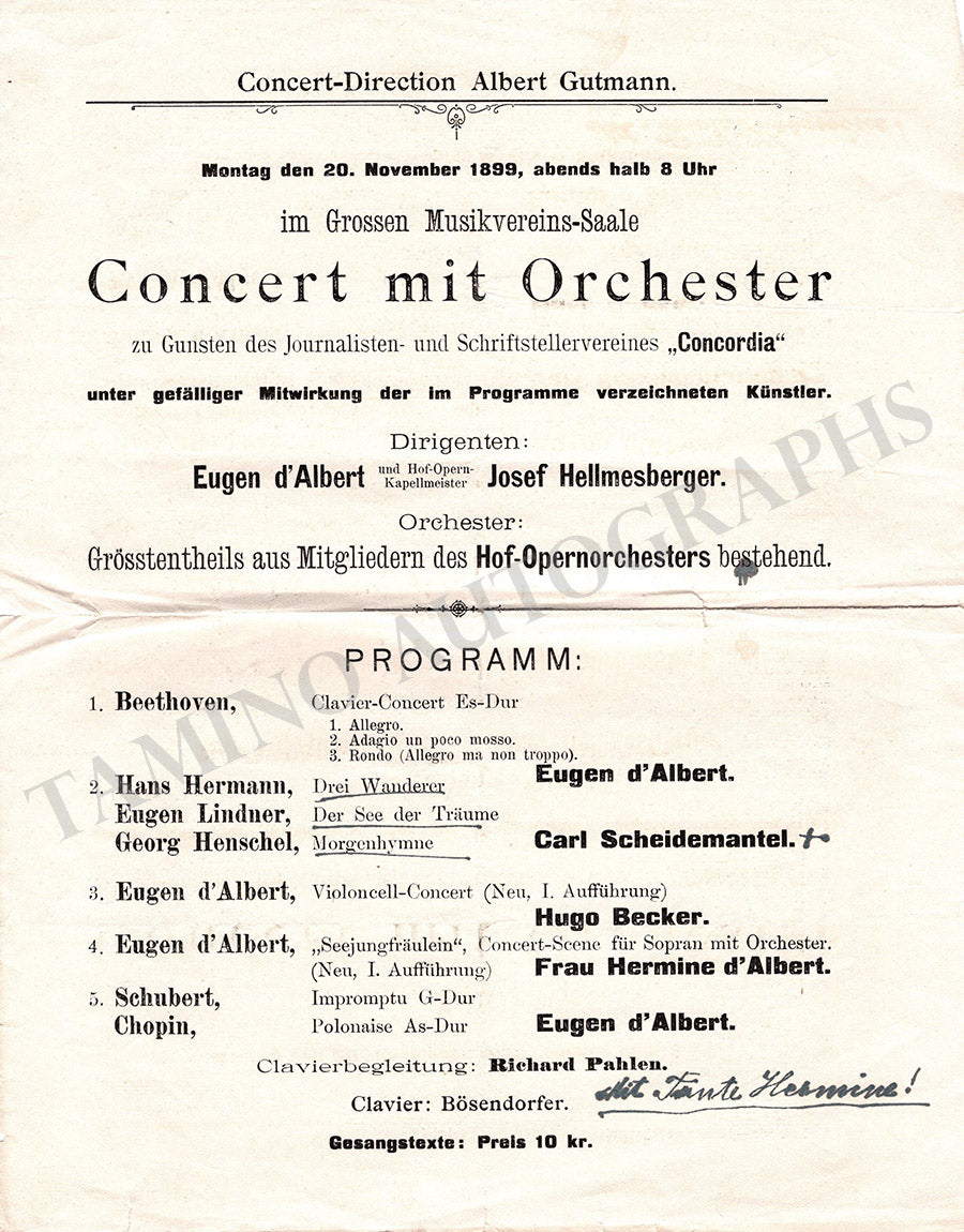 Program (unsigned) for a concert of the Scottish-born German composer conducting some of his own music in Vienna, November 20th, 1899.