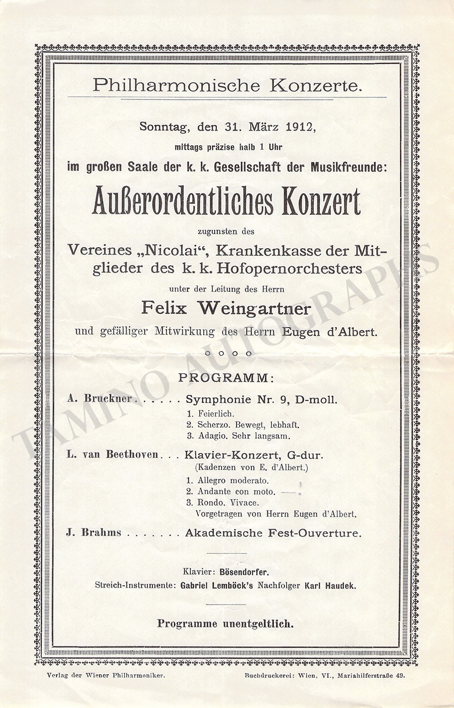 Program for a concert featuring the Scottish-born German composer and pianist performing Beethoven's Piano Concerto No. 4 with the Vienna Philharmonic under the baton of Felix Weingartner on March 31, 1912.