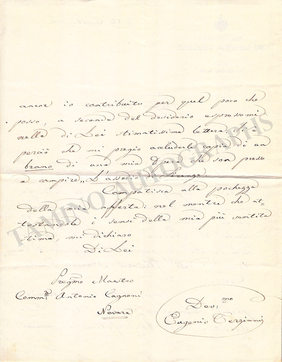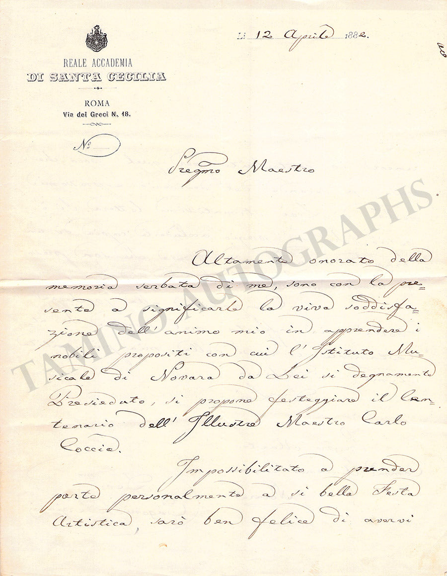 Autograph letter in Italian (untranslated) signed by him and dated 1882, addressed to Antonio Cagnoni forwarding him an extract of his opera L'Assedio di Firenze to celebrate the centennial of Maestro Carlo Coccia. Size is 8.2 x 10.6 inches approx., 2 written pages, Santa Cecilia Academy letterhead, central fold, in very good condition.