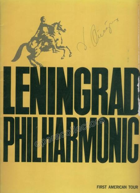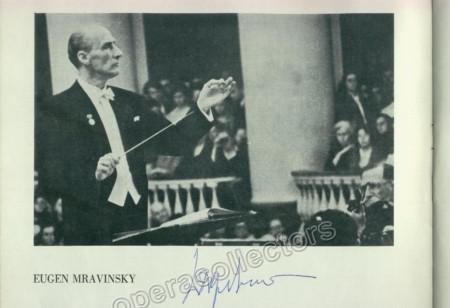 Evgeny Mravinsky signs under large photograph conducting (19 x 12 cm!), David Oistrakh signs cover Leningrad Philharmonic First American Tour in 1960. Many photographs. 23 x 31 cm, 16 pages. Mravinsky autographs are very scarce.