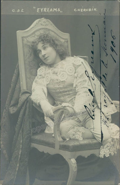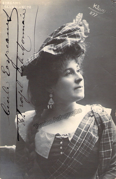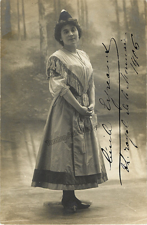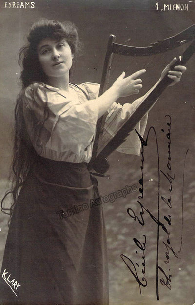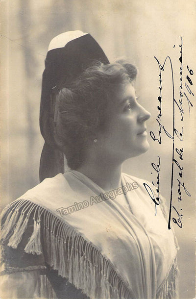 Fine black-and-white photo postcard signed by her, shown in Les Huguenots; blind-stamped on the front by photographer Klary (Brussels). Size is 3.3 x 5.3 inches, in overall very good condition.