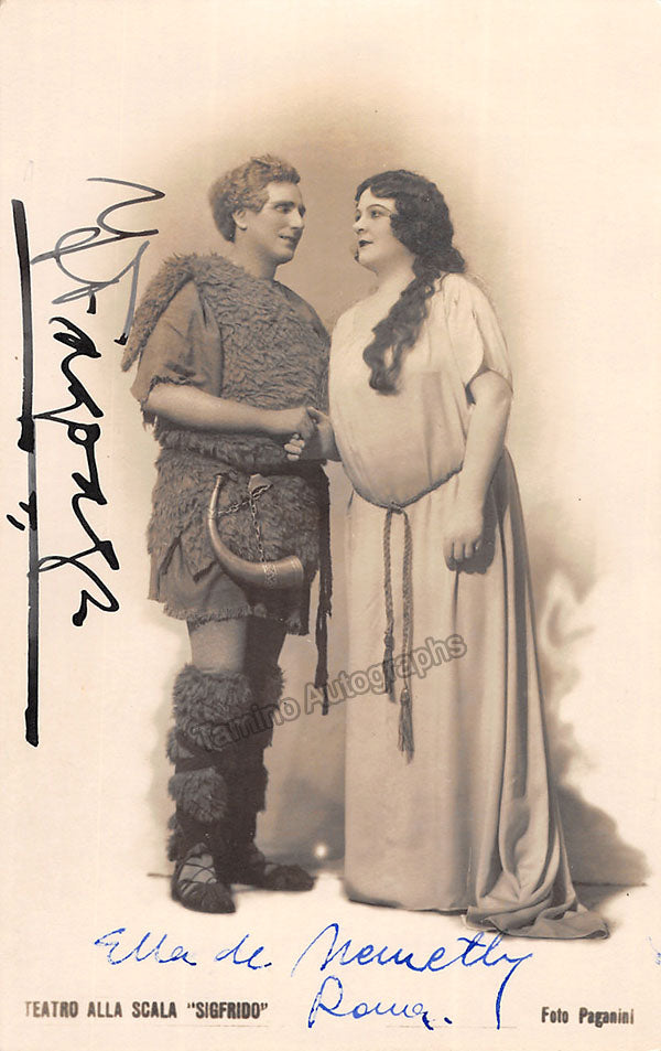 Spanish tenor (1895-1976), and Hungarian soprano/mezzo-soprano (1895-1961), both best known for their interpretations of Wagnerian roles during the first half of the 20th century. Double signed postcard photograph, shown as Siegfried and Brunnhilde in Wagner's Siegfried at La Scala, Milan, photo by Paganini. Size is 3.5 x 5.5 inches, mounting traces on verso, otherwise in excellent condition.