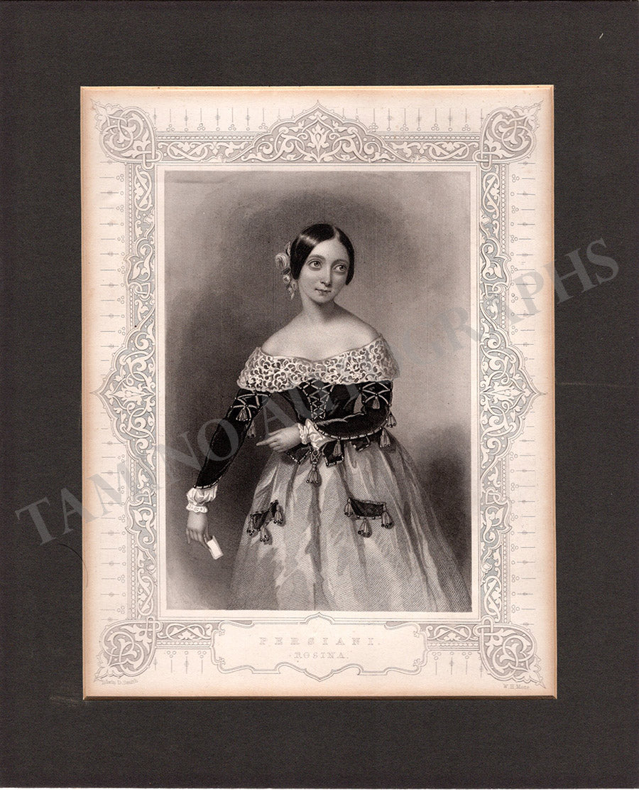 Nice black-and-white print of her mounted on a mat, depicted as Rosina in Rossini's "Il Barbiere di Siviglia" by artist David Bogue (1844). Total size is 9 x 11 inches, in very good condition.