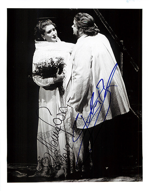Italian soprano (b.1964) and the South African tenor (b.1965).  Double signed photo shown in role in Puccini's Tosca as Floria Tosca and Mario Cavaradossi.  Size is 8 x 10 inches, in very good condition.