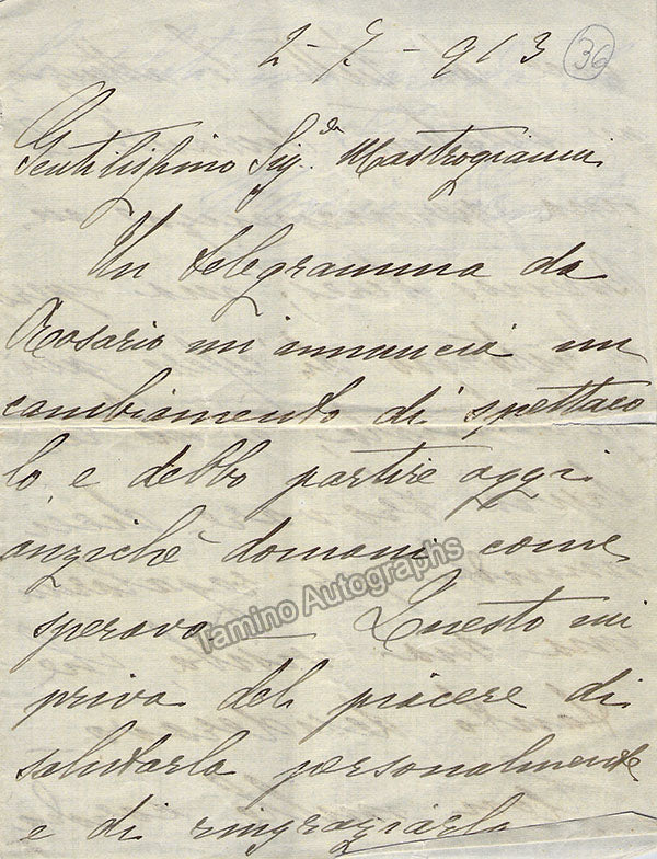 Autograph letter signed, 3 pages, written in Italian, sold untranslated, dated in 1913. Size of each page is 5.25 x 6.75 inches, very small creases on bottom and tears in middle, otherwise in very good condition.