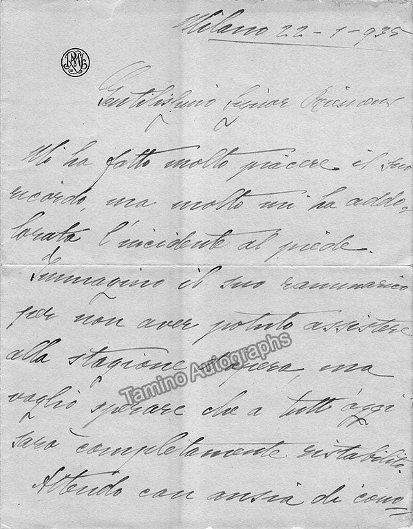 Autograph letter signed, 2 pages, written in Italian, sold untranslated. Written in Milan, dated in 1935. Size is 6.25 x 8.25 inches, some jagged edges, otherwise in very good condition.