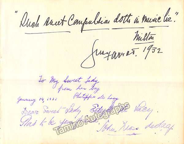 Also included: an additional signature on this page is that of the French born child actor in silent films and later advertising agency executive and film and television director Philippe De Lacy (1917-1995), whose film career began with a visit to the set of Farrar's film The Riddle: Woman in  1921. His inscription with sentiment appears to be addressed to Farrar. Size is 6.5 x 8.25 inches, some wear on edges, otherwise in very good condition.