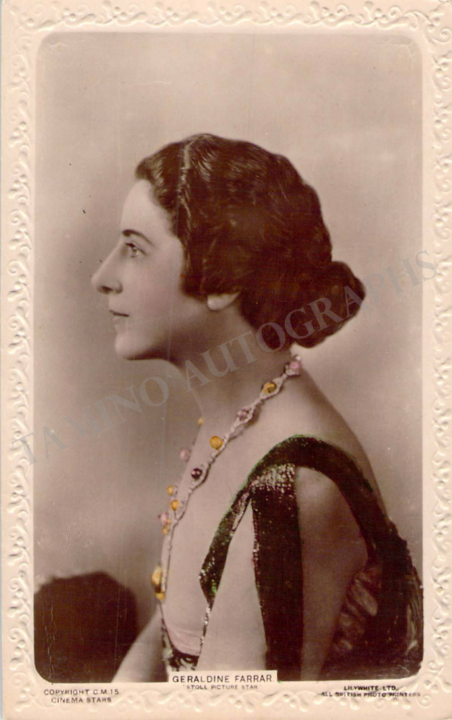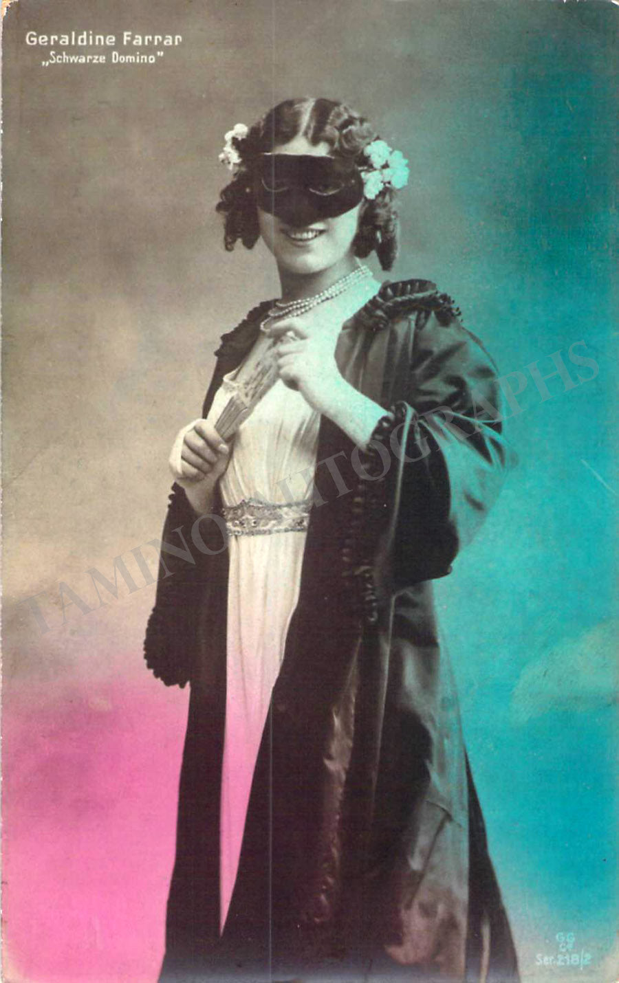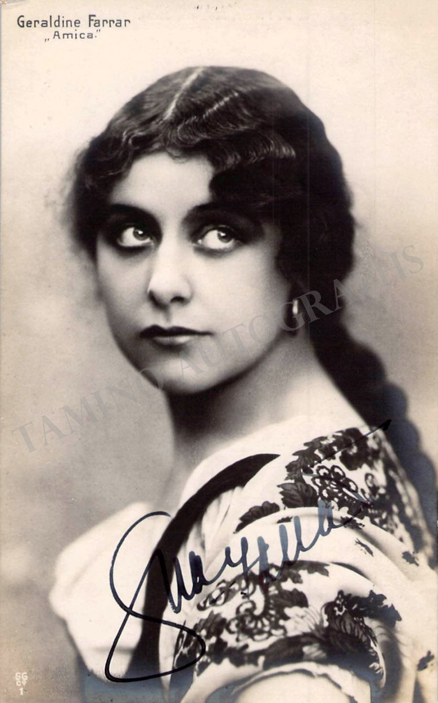 Beautiful black-and-white photo postcard signed by her, shown in role in Mascagni's opera Amica. Size is 3.3 x 5.3 inches, in excellent condition.