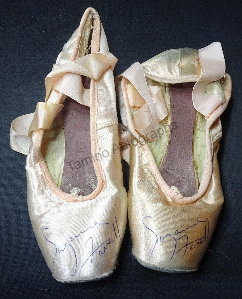 Pair of pointe shoes, one signed by her, used in performance, together with a small pin with a photo of her. Approx. 3 x 8.5 inches, in good condition.