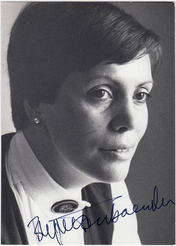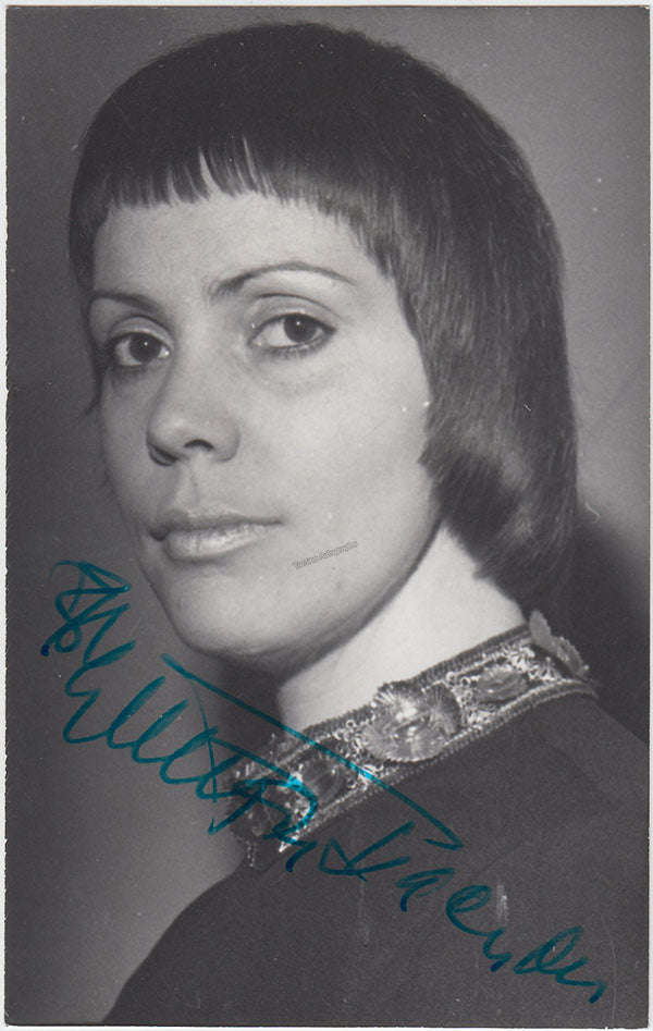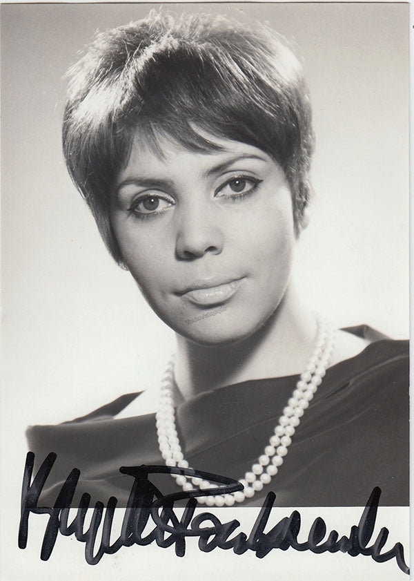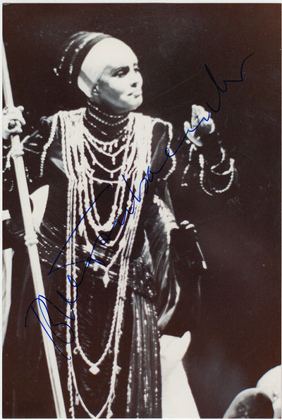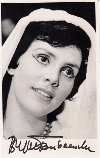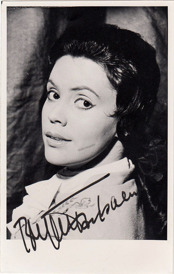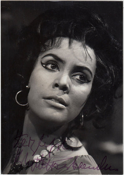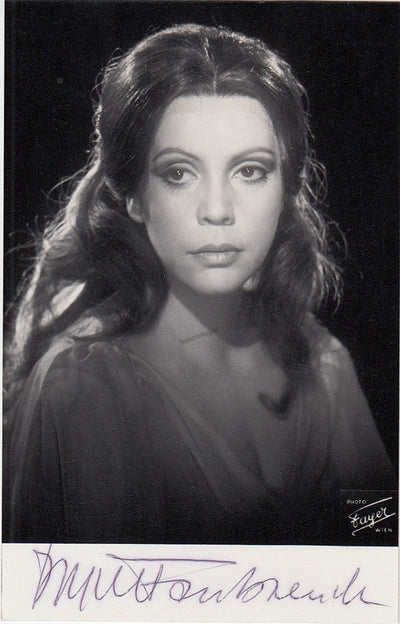 Fine black-and-white photo postcard signed by her in 1969, shown as Salomé in Strauss' opera; ink-stamped on verso by photographer Rudolf Setz (Munich). Size is 4.1 x 5.75 inches, in excellent condition.