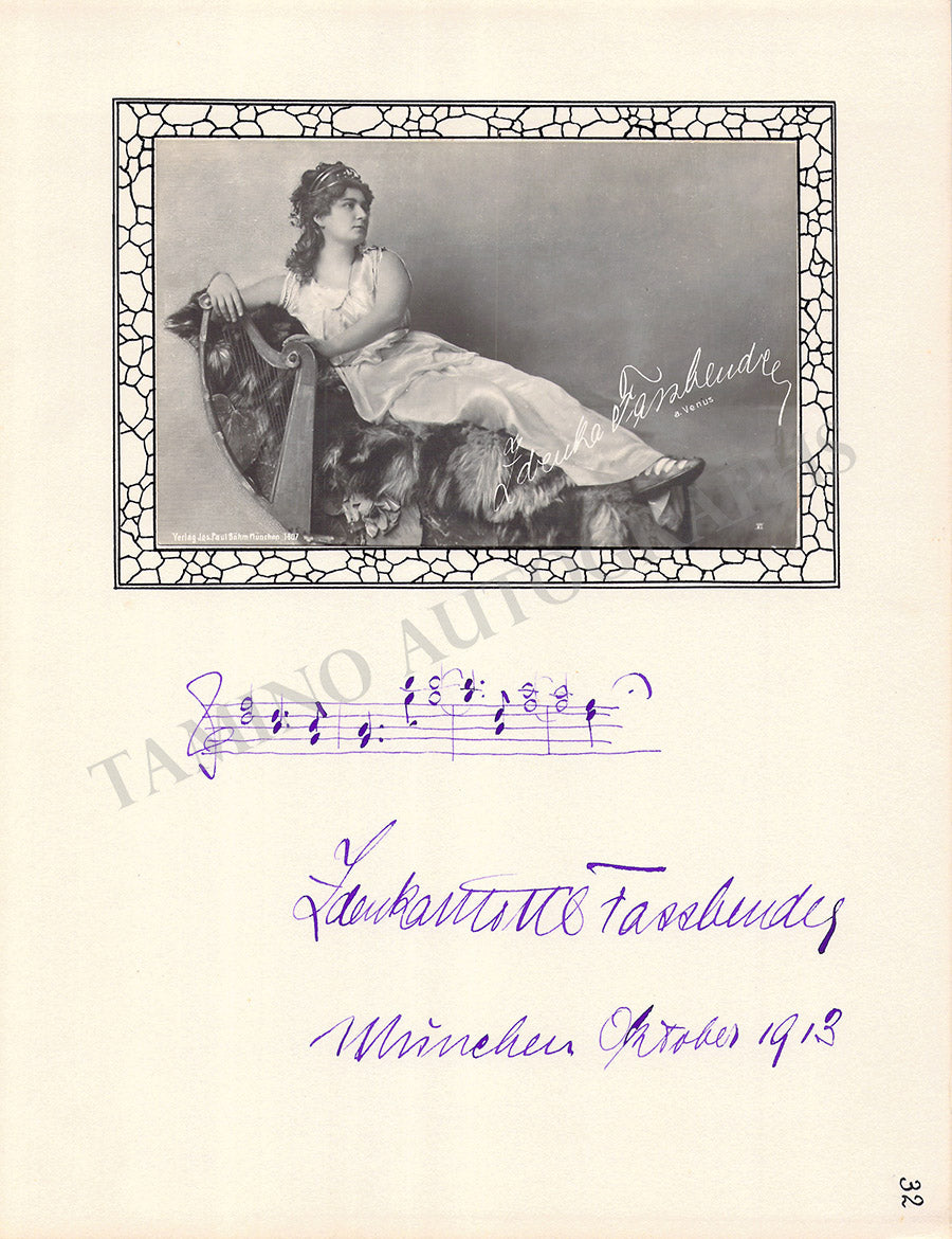 Signed album page on soft cardboard containing a 3.5 x 5.5 inch postcard photograph of her as Venus in Wagner's Tannhauser (the photo contains a printed signature, the handwritten signature is on the bottom of the cardboard on which this photo is matted), dated in Munich in 1913. There is also a musical quote from the opera.  Total item size is 8 x 10.5 inches, beautifully preserved in excellent condition.