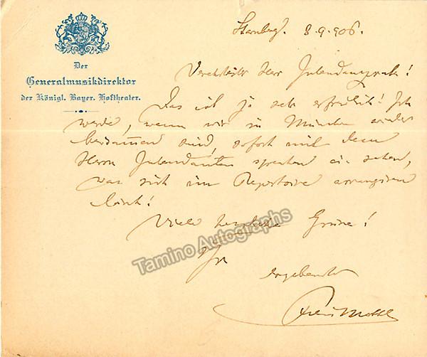 Autograph note signed and dated by him in 1906, on a medium size cardboard card with the letterhead from the Royal Theater of Bavaria, in German, sold untranslated. Size is 6.5 x 5.5 inches, in excellent condition