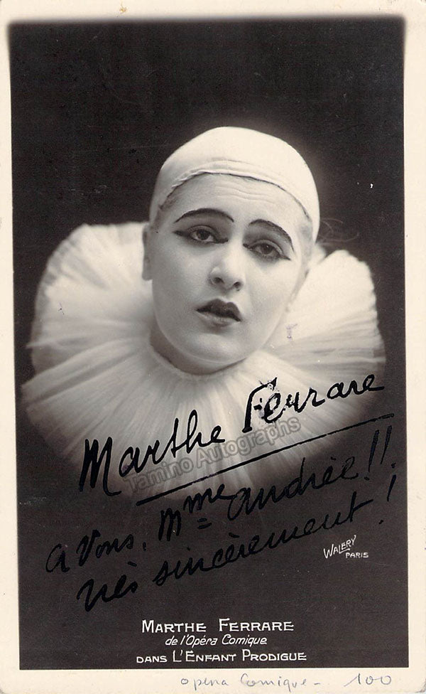 French Algerian soprano (1899-?), signed postcard photograph, shown in role in Daniel Auber's L'Enfant Prodigue, inscribed. Front contains printed signature of photographer Walery, Paris. Size is 3.25 x 5.25 inches, in excellent condition.