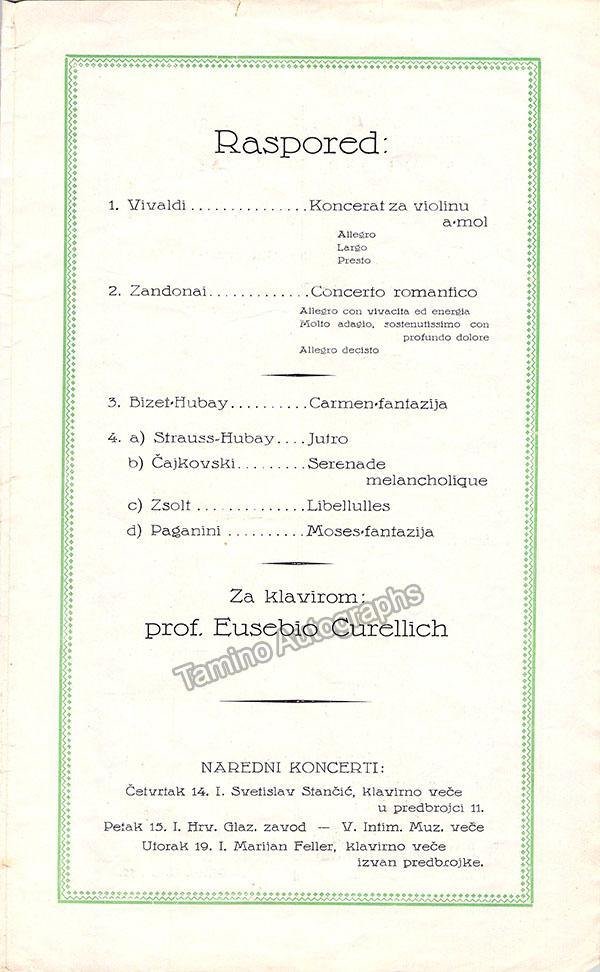 Program for a performance of the Croat-Italian violinist in Zagreb, 1926, signed by her on the first page.  Size is 5.5 x 9 inches, 8 pages including cover, some wear, minor creases, in very good condition.
