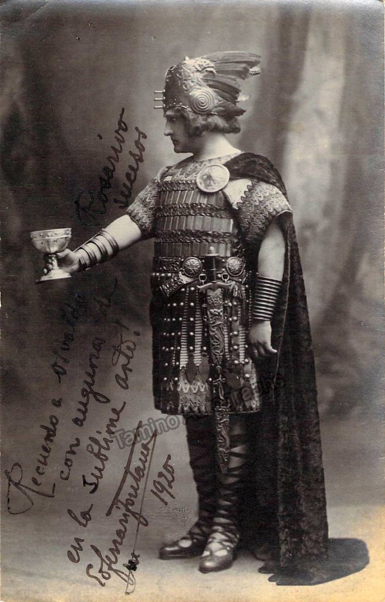 Italian tenor (1878-1936), signed photo postcard, shown as Tristan in Wagner's Tristan und Isolde. Considered the leading Italian Wagnerian tenor of his day, sang at La Scala, the Met and Teatro Colon in Buenos Aires and left several recordings. Inscribed with sentiment, dated 1920. Size is 3.5 x 5.5 inches, with some silvering and wear on edges not affecting the signature.