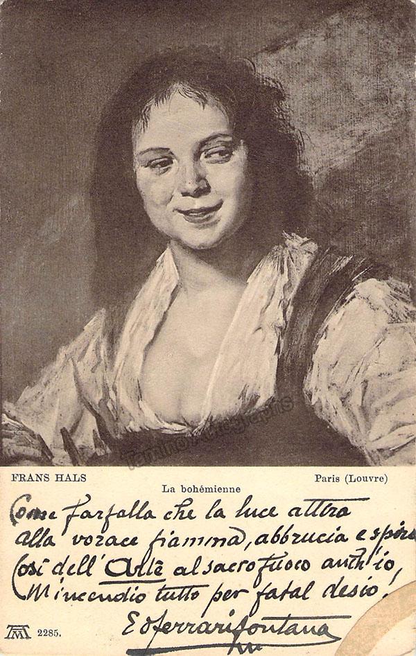Italian tenor (1878-1936), signed and inscribed postcard, showing a painted image by the Dutch painter Frans Hals entitled "La Bohemienne" taken from Paris's legendary Louvre art museum. Size is 3.5 x 5.5 inches, with a small piece of unobtrusive tape on bottom right, otherwise in excellent condition.