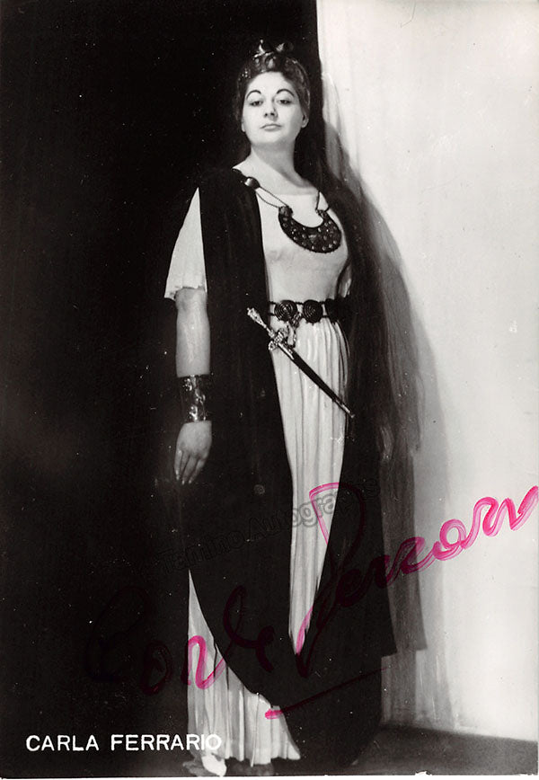 Italian soprano (?-2012), signed photograph, shown in the title role of Bellini's Norma. Size is 4 x 5.75 inches, slight paper loss on edges, otherwise in very good condition.
