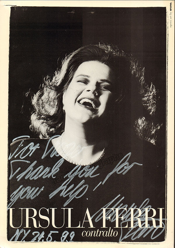 Swiss contralto, signed publicity photograph, shown as herself, inscribed, and dated in New York in 1989. Size is 8.25 x 11.75 inches, several small creases on edges, otherwise in excellent condition.