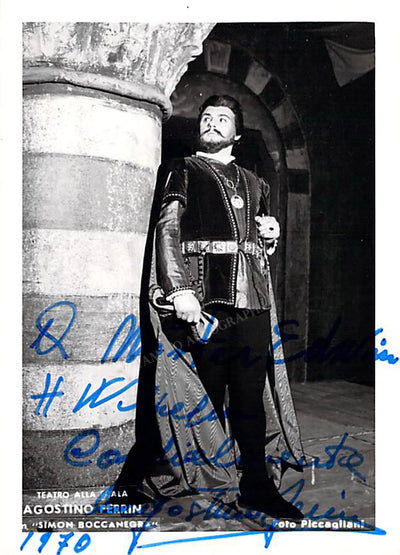 Signed Photograph, shown as Fiesco in Verdi's Simon Bocanegra at La Scala, Milan. Inscribed and dated in 1970. Photo by E. Piccagliani, Milan. Size is 4.1 x 5.75 inches, in excellent condition.