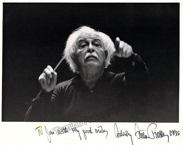 Signed photograph, shown conducting, inscribed and dated in 1975. Size is 10 x 8 inches, stamped on verso by photographer David Weiss, Los Angeles.