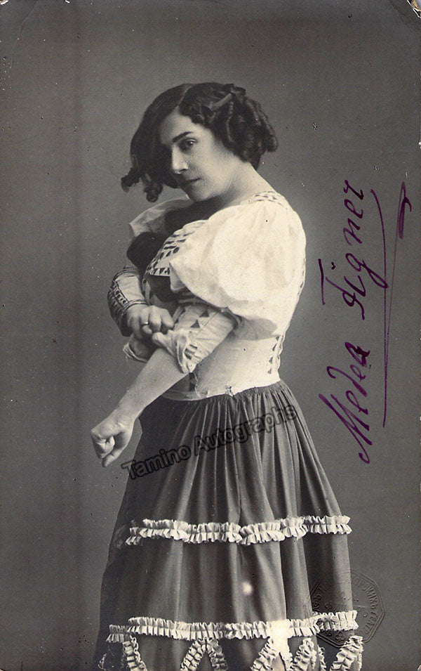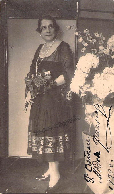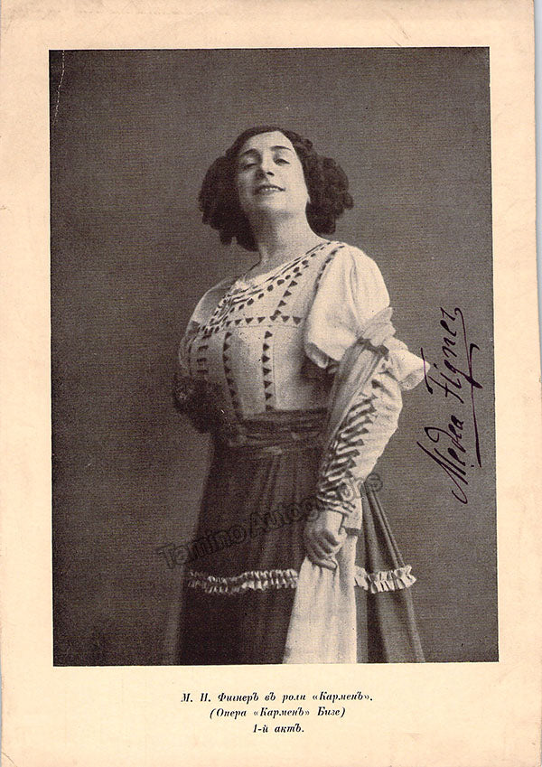 Signed postcard photograph, shown in the title role of Bizet's Carmen. Bold handwriting and signature. Size is 3.5 x 5.5 inches, several small creases and slight paper loss on corners, otherwise in very good condition.