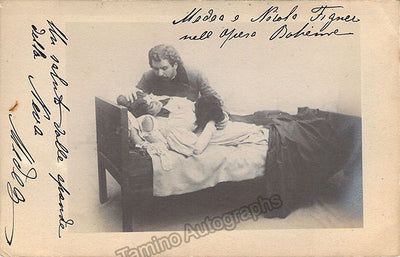 Signed postcard photograph, shown as Mimi in Puccini's La Boheme with her husband tenor Nikolai Figner as Rodolfo. Size is 3.5 x 5.5 inches, small crease on top right, otherwise in very good condition.