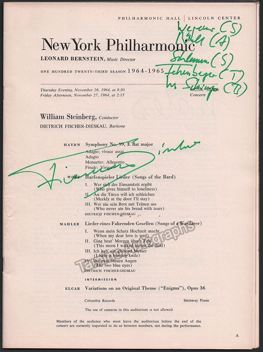 Set of 2 concert programs plus 1 signed program page, including a full program (1964), a full program with pianist (1967) at Carnegie Hall, and a program page (1964) for a concert with the New York Philharmonic. All are 8.4 x 10.75 inches in size, in very good condition.