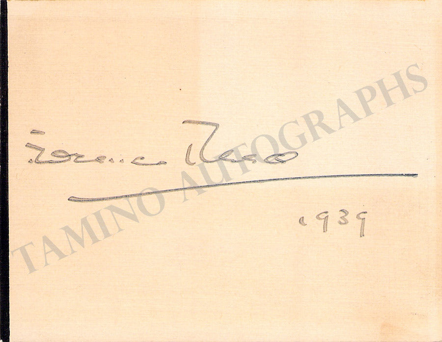 Nice small card signed by her and dated 1939. Size is 4.6 x 3.6 inches, rust stains, in overall very good condition.