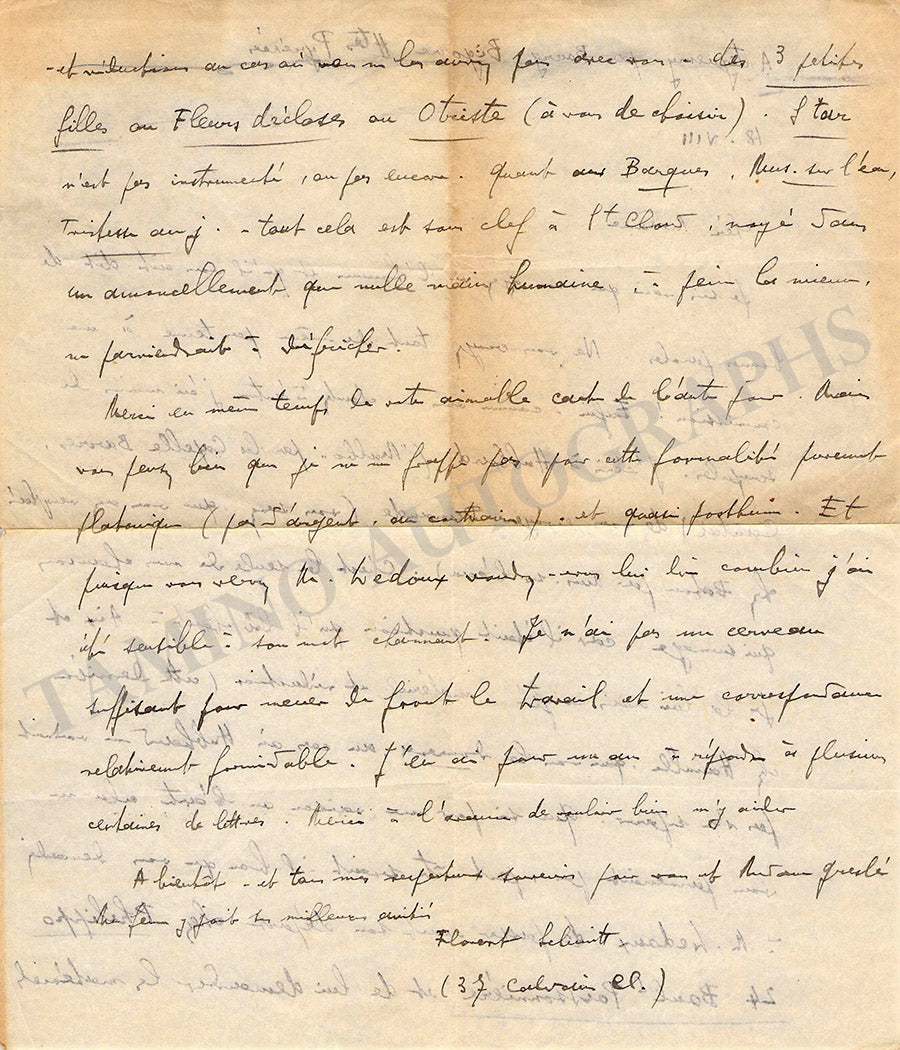Beautiful autograph letter in French (untranslated) signed by him, dated August 18, no year, where he points to its correspondent  about the scores of a  series of songs: “…Si pour une raison ou une autre cela ne vous parvenait pas, peut-être serait-il bon que vous demandiez à M. Ledoux de passer avant son départ chez Philippo…et de lui demander les matériels… au vas où vous ne les auriez pas avec vous – des 3 Petites Filles ou Fleurs décloses…”.