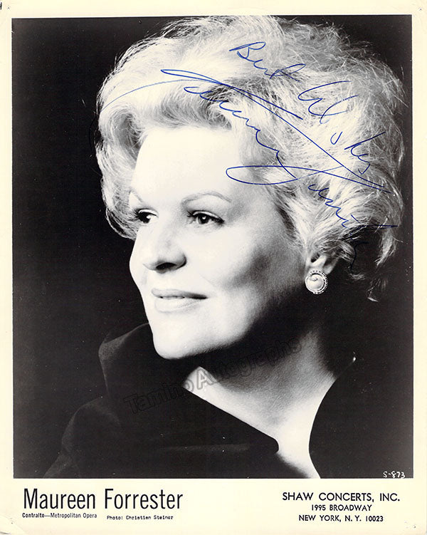 Canadian contralto (1930-2010), signed publicity photograph, shown as herself. Photo by Christian Steiner. Size is 8 x 10 inches, small creases on various edges, otherwise in very good condition.