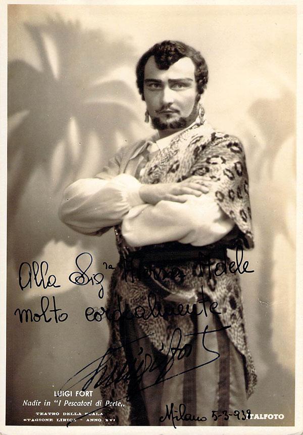 Italian tenor (1907-1976), signed photo postcard, shown as Nadir in Le Pecheur de Perles. Inscribed and dated in 1938. Photo by Italfoto, Milan. Size is 4 x 5.8 inches with some small creases near top left as well as on very bottom edges of the photo but in otherwise excellent condition.