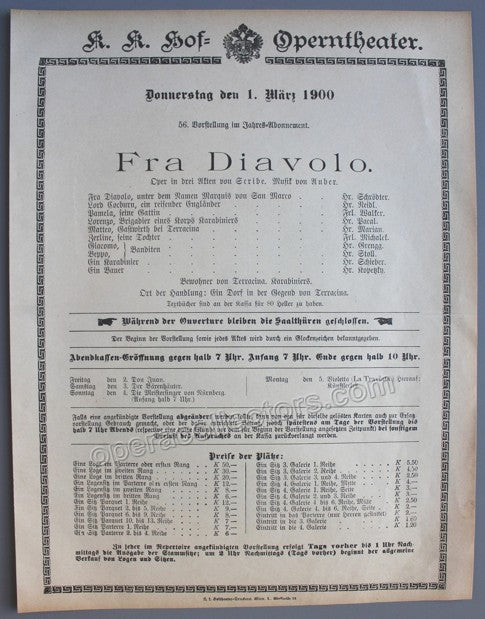 Mahler conducts Fra Diavolo – Auber. March 1st, 1900. Playbill Imperial & Royal Court Opera Vienna Wiener Hofoper (the conductor name is not mentioned - as it was usual on Vienna Hofoper playbills until 1910, although it is documented that for this performance was conducted by Gustav Mahler)