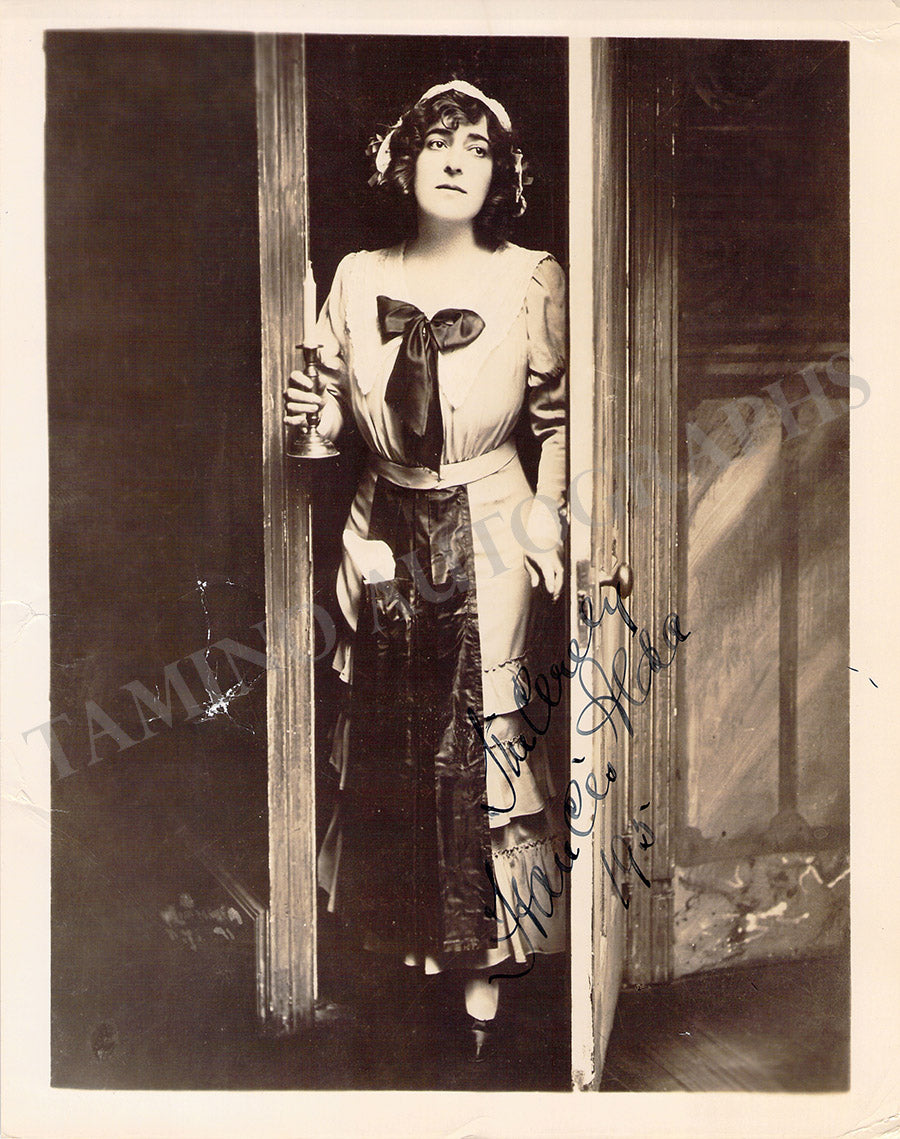 Gorgeous black-and-white photograph signed by her with a short sentiment dated 1950, shown as Mimí in Puccini's opera La Bohème. Size is 8 x 10.1 inches, evident crease and loss of paper at the center-left (not affecting signature), ink writing on verso, in very good condition.