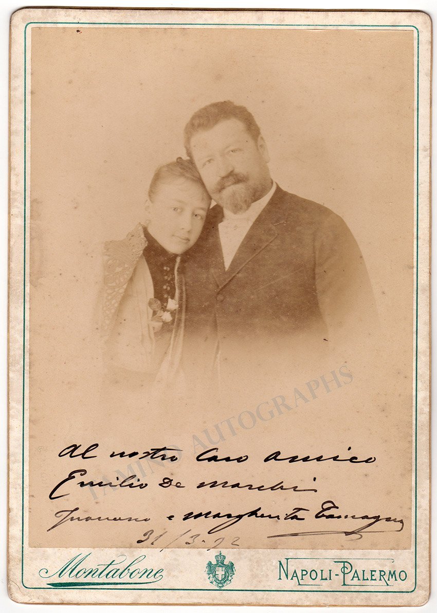 Large size cabinet-style photograph, shown next to his daughter Margherita, boldly signed by him below as "Francesco e Margherita Tamagno", inscribed to famous Italian tenor Emilio de Marchi (1861-1917). A photo by Montabone, Naples, Italy, size is 6.75 x 9.5 inches, in very good condition.