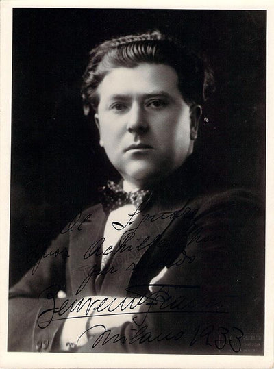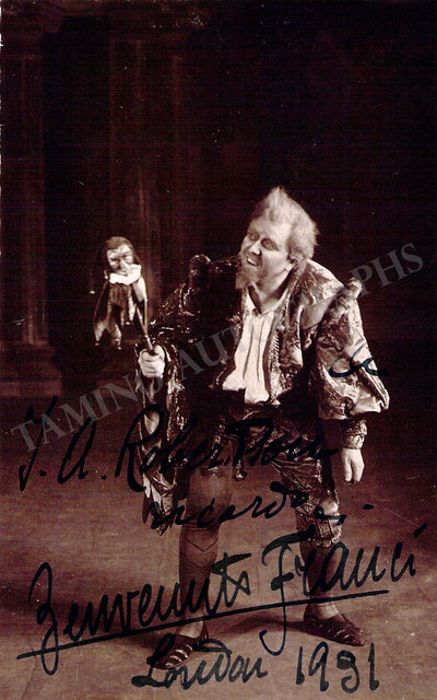 Beautiful sepia photo postcard signed by him in London, 1931, here shown in the title role of Verdi's opera Rigoletto; blind-stamped on the front by photographer Vaghi (Parma). Size is 3.25 x 5.25 inches, jagged edges, in very good condition.
